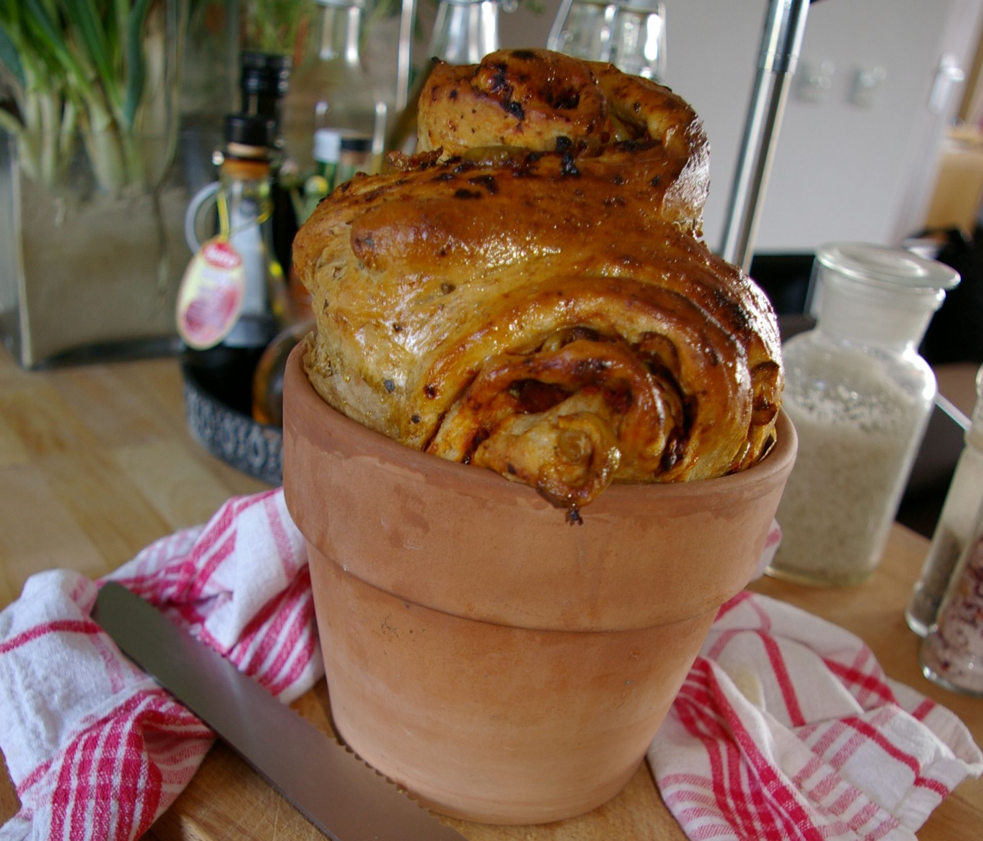 Doe de beide deegrollen voorzichtig in de bloempot met de zichtbare ringen naar boven. Laat het deeg in de pot nu weer 30 minuten rijzen op een warme plek.