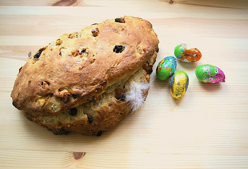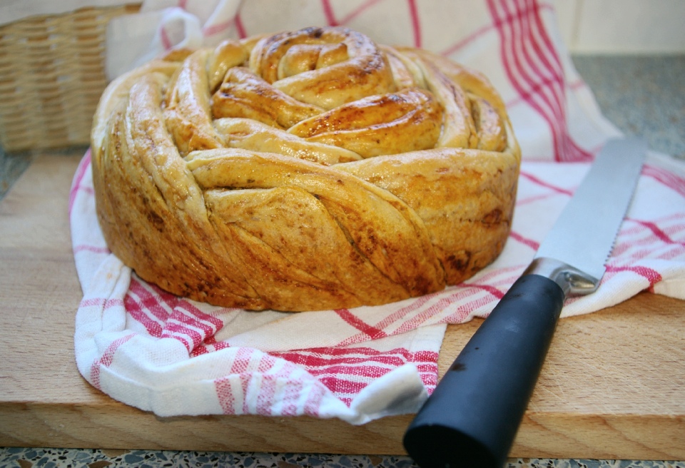Maak een lange vlecht met deze twee helften. Rol de vlecht nu op in de vorm van een slakkenhuis, en leg het deeg voorzichtig in een met bakpapier bedekte springvorm. Laat het deeg nogmaals een half uur rijzen op een warme plaats. Verwarm de oven voor op 200 gr. Celsius. Bak het deeg eerst 5 minuten voor op 200 graden en daarna 30 minuten op een temperatuur van 175 graden. Na het bakken het brood insmeren met een beetje olijfolie om een mooi accent aan de kleur en vorm te geven. Laat het brood nu afkoelen.