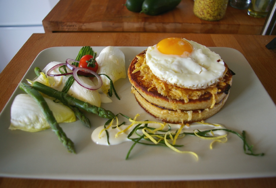 Voor het afwerken van de croque leg je op één pancake een handje geraspte kaas en doe er de tweede pancake op met daarop weer een laagje geraspte kaas.