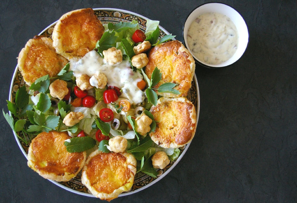 Doe de vulling in de bladerdeeg en duw het licht aan, giet hierover het mengsel van ei en yoghurt en een beetje geraspte kaas.