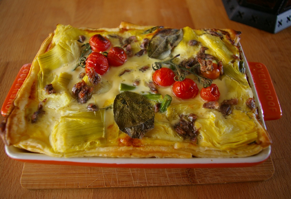 Verdeel hierover de ansjovis, de asperges, de in stukjes en afgegoten en gedroogde artisjokharten.