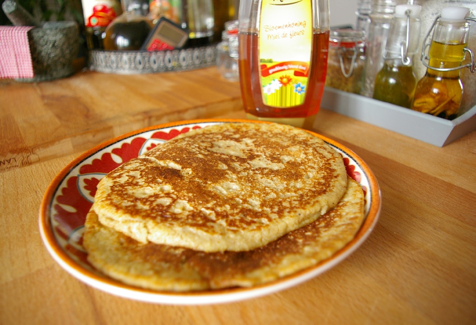 Bak de pannenkoeken zoals de gewone versie. serveer het met rietsuiker, honing of ahornsiroop