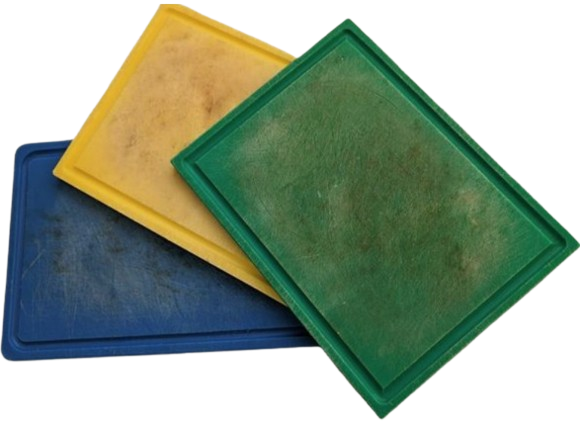 Veel mensen, en vooral binnen de horeca, zweert men bij het gebruik van kunststof snijplanken, het zou hygiënisch zijn en beter schoon te maken. Gelukkig is men van deze gedachte teruggekomen. De hele wereld spreekt kwaad over microplastics die overal in zitten, tot in je bloed. Door met messen in een kunststof plaat te snijden terwijl jij je eten aan het bereiden bent, zorg je ervoor dat je zelf microplastics in je eten toevoegt. Dat willen we niet. Op de foto zie je een voorbeeld van de meest gore plastic snijplanken, die niet meer te reinigen zijn. Ze komen in de horeca nog veel voor.